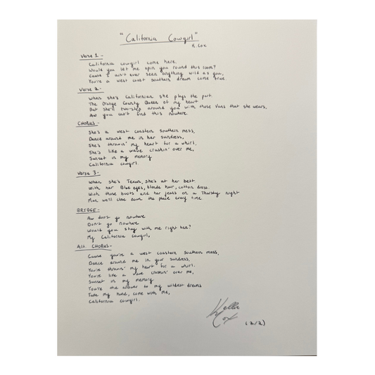 "California Cowgirl" Handwritten Lyrics Sheet
